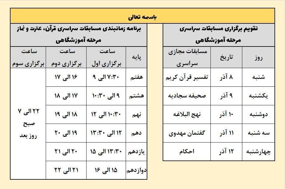 تاریخ، زمان و شیوه برگزاری آزمون های کتبی سراسری مرحله آموزشگاهی مسابقات قرآن، عترت و نماز