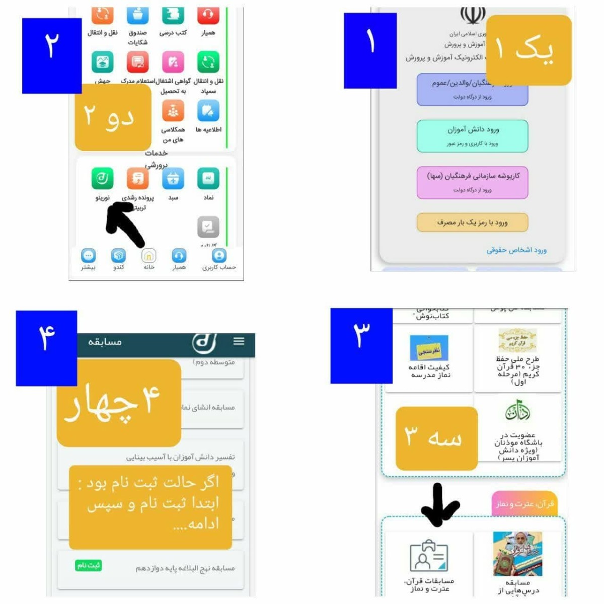 ✍️ مراحل آزمون در تصویر بالا? دقت شود ، در مرحله ۴ ، اگر گزینه ثبت نام بود، ابتدا روی ثبت نام کلیک کنید و سپس در آزمون شرکت کنید.