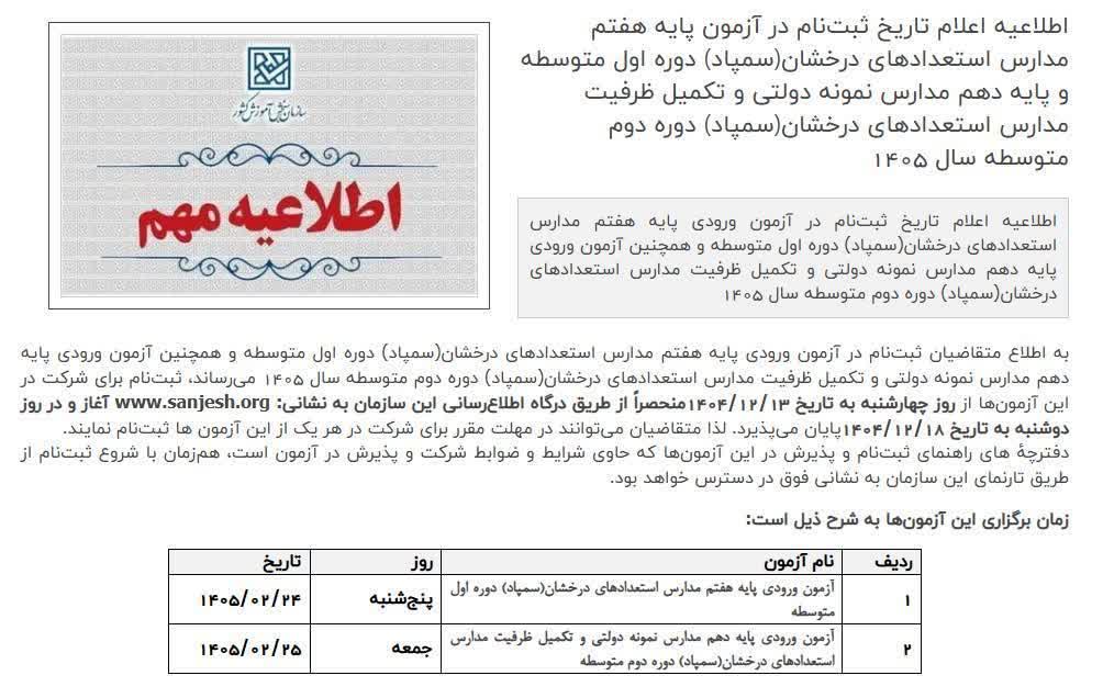 * بر اساس اعلام سازمان سنجش آموزش کشور، ثبتنام آزمون ورودی پایه هفتم سازمان ملی پرورش استعدادهای درخشان (سمپاد) در دوره اول متوسطه، آزمون ورودی پایه دهم مدارس نمونه دولتی و همچنین تکمیل ظرفیت مدارس سمپاد در دوره دوم متوسطه، از تاریخ ۱۴۰۴/۱۲/۱۳ آغاز و در روز دوشنبه ۱۴۰۴/۱۲/۱۸ پایان میپذیرد.